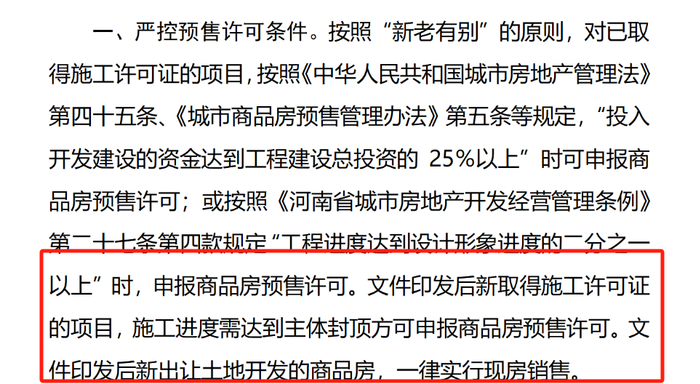公告内容显示,文件印发后新取得施工许可证的项目,施工进度需达到主体封顶方可申报商品房预售许可。文件印发后新出让土地开发的商品房,一律实行现房销售。