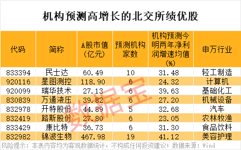 根据5家以上机构一致预测,今明两年净利润增速均有望超20%的股票有8只,包括瑞华技术、开特股份、锦波生物、康比特、民士达等。