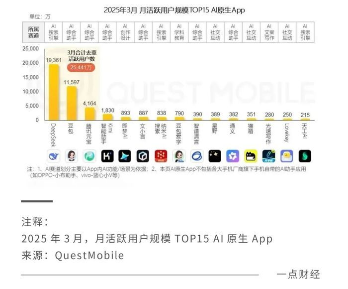 根据QuestMobile数据,今年3月月活用户TOP15的AI原生APP中,DeepSeek、豆包、腾讯元宝、Kimi位列前四,百小应榜上无名。