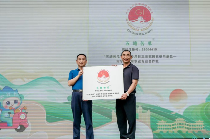 活动现场,兴宁区副区长陈志华向南宁市国翠农业专业合作社负责人陆坚邦授权使用“五塘苦瓜”地理标志企业专用标志。(兴宁区融媒体供图)
