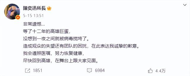 此前5月15日,陈奕迅被诊断确诊为新冠肺炎,原定于5月16日至18日的高雄巨蛋演唱会紧急延期。