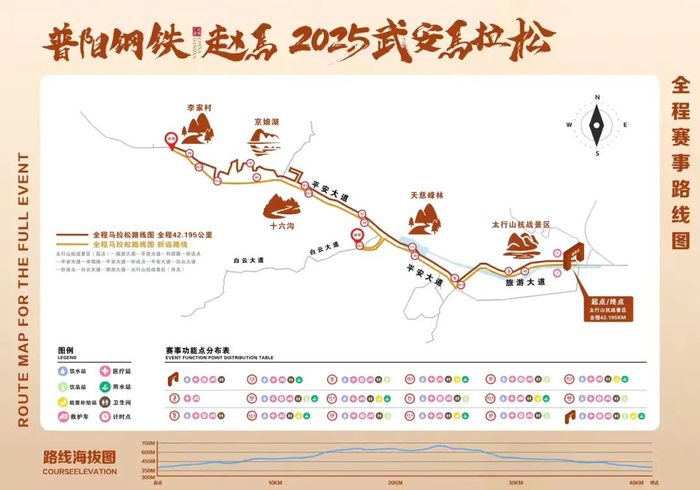 全程马拉松:太行山抗战景区(起点)—旅游大道—平安大道—幸福路—平安大道—折返点—龙门沟街—平安大道—白云大道—折返点—白云大道—平安大道—旅游大道—太行山抗战景区(终点)