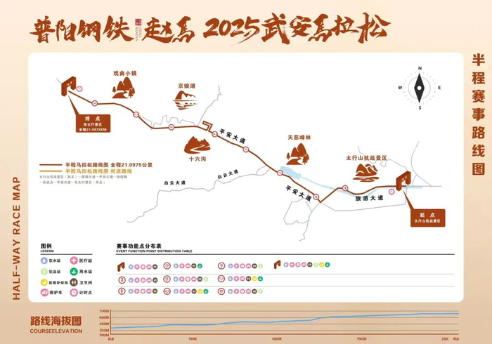 半程马拉松:太行山抗战景区(起点)—旅游大道—平安大道—楼上村—折返点—楼上村—平安大道—东太行景区(终点)