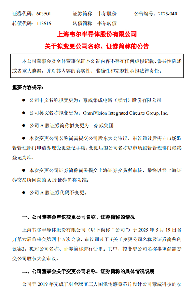 5月19日,上海韦尔半导体股份有限公司(韦尔股份,603501)发布公告称,公司拟将公司名称从“上海韦尔半导体股份有限公司”变更为“豪威集成电路(集团)股份有限公司”,证券简称从“韦尔股份”变更为“豪威集团”,证券代码保持“603501”不变。该议案已获第六届董事会第四十五次会议全票通过,尚需提交股东大会审议。