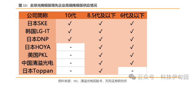 国内光掩模产品与国外差距逐步缩小。国内的掩模版产业相比国际竞争对手起步较晚,经过二十余年的努力追赶,国内掩模版产品与国际竞争对手在新品推出的时间差距逐步缩短、产品性能上差距越来越小。在平板显示光掩模行业,根据 Omdia统计的 2022年全球平板显示掩模版企业销售金额排名,前五名分别为福尼克斯、SKE、HOYA、LG-IT和清溢光电。