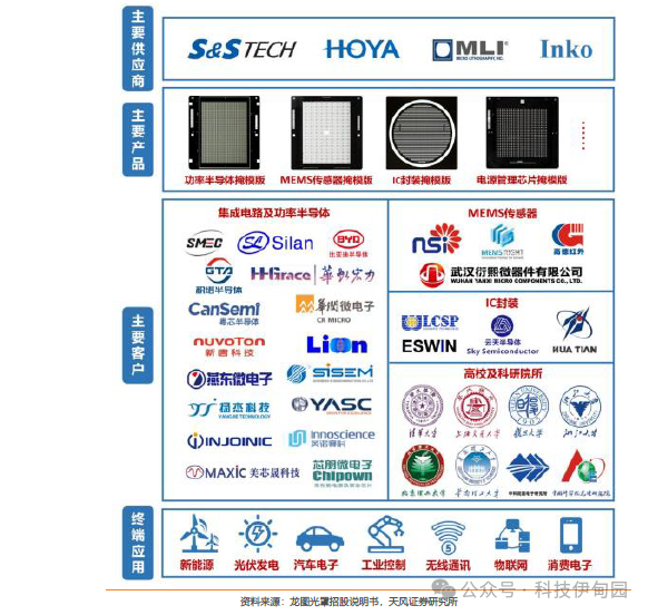 龙图光罩是国内稀缺的独立第三方半导体掩模版厂商。公司紧跟国内特色工艺半导体发展路线,不断进行技术攻关和产品迭代,半导体掩模版对应下游半导体产品的工艺节点从 1μm 逐步提升至 130nm,产品广泛应用于功率半导体、MEMS 传感器、IC 封装、模拟 IC 等特色工艺半导体领域,终端应用涵盖新能源、光伏发电、汽车电子、工业控制、无线通信、物联网、消费电子等场景。