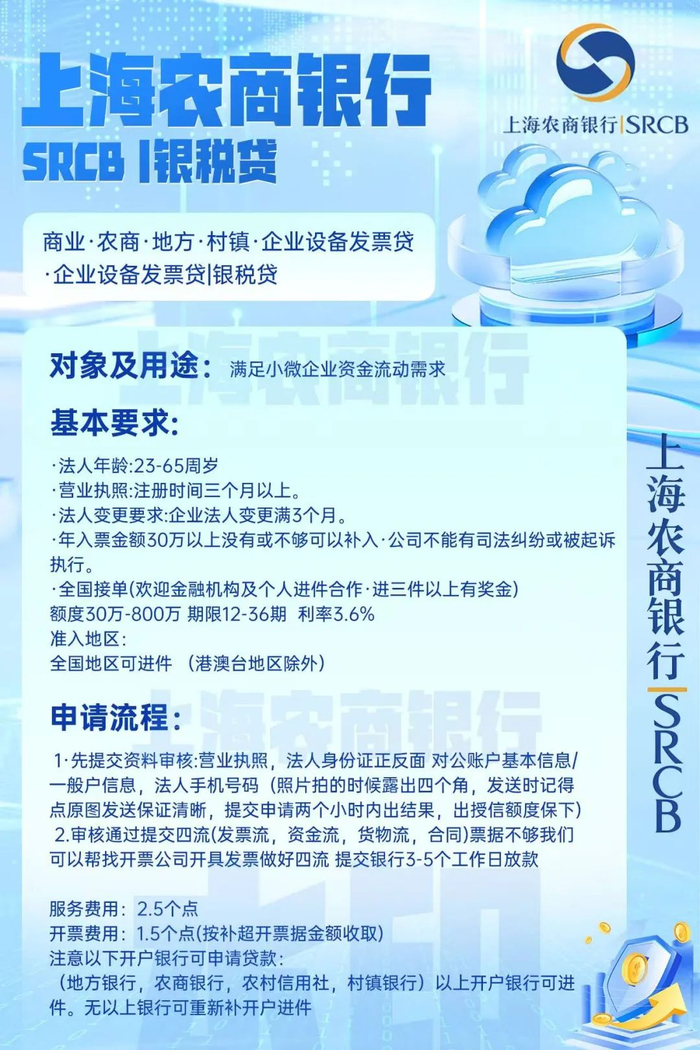 上海农商银行精准捕捉小微企业痛点,推出“银税贷·发票贷”产品,以低门槛、高效率、全国覆盖的优势,直击企业资金周转难题。该产品最高额度800万元,年化利率低至3.6%,期限灵活(12-36期),且无需抵押担保,仅凭企业开票和纳税记录即可申请。