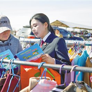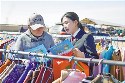 近日,通辽市扎鲁特旗人民检察院“萨日朗”公益法律顾问团深入乌力吉木仁苏木集市,开展“检察官助力基层治理”主题活动,通过“零距离”普法、“面对面”解忧,推动检察服务向基层延伸,切实将检察工作转化为惠民实效。图为检察人员向现场群众发放宣传资料、解答法律问题。本报记者 郝佳丽 摄