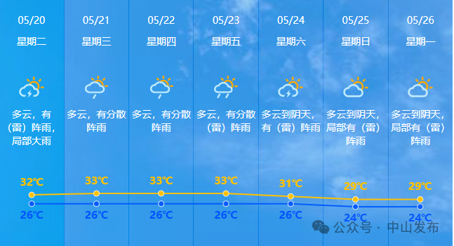 预计今日至23日受持续的偏南气流影响,我市有阵雨或雷阵雨天气,间中雨势较大;展望24-26日,受切变线影响,我市再有雷雨天气。