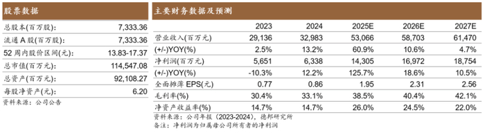 盈利预测:我们预计公司2025-2027年归母净利润分别为143.05、169.72、187.54亿元,同比+125.7%、+18.6%、+10.5%,对应EPS分别为1.95、2.31、2.56元。