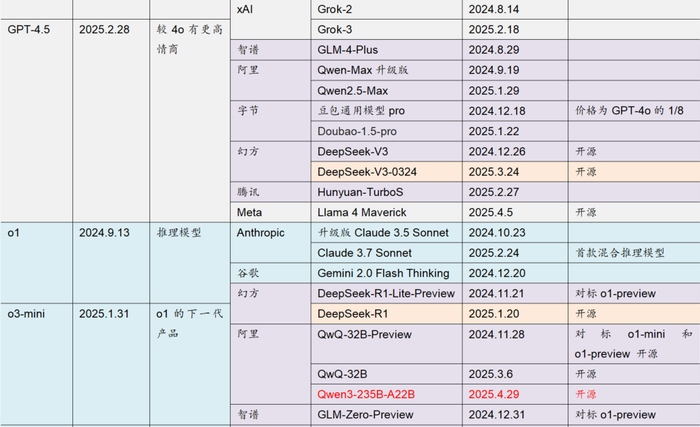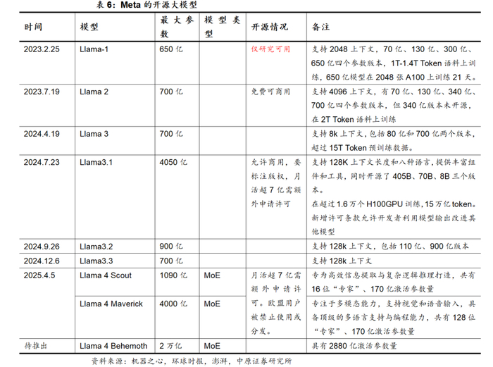 在发展路径方面,OpenAI受到DeepSeek的压力,重新开启了开源的布局。4月25日,OpenAI时隔6年再次推出开源大模型Open-Weight(模型性能接近o3-mini级别),并向所有用户开放其核心工具Deep Research的轻量版本。OpenAI允许开发者部署、微调Open-Weight的模型参数,但不完全公开训练代码和数据,允许大公司商用。