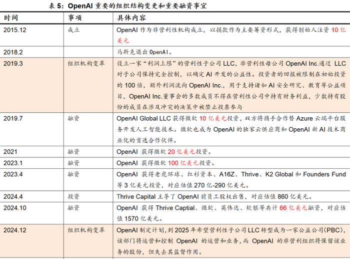 在公司架构的调整方面,OpenAI正在寻求转型为公益公司(PBC),并为后续IPO扫清公司架构上的障碍。继2024年12月提出重组计划以后,5月6日OpenAI更改了这一转型计划,继续推进项PBC的转型并放开对投资人100倍利润上限的限制,其中关键的妥协在于,非营利性母公司将继续保持对公司的最终控制权。根据3月OpenAI与软银400亿美元的投资协议,OpenAI需要保障PBC的转型成功,否则总投资将减至200亿美元。作为OpenAI的关键投资人,根据5月12日《金融时报》报道,微软对OpenAI进行了妥协,OpenAI和微软洽谈数十亿美元的全新融资与合作,旨在让OpenAI能够在未来实现首次公开IPO上市。微软通过放弃OpenAI新营利性业务中的部分股权(按照双方此前协议,在2030年之前微软将会获得OpenAI 1740亿美元20%的收入,本次协议或意味着微软收入分成比例的降低),以换取2030年之后微软对OpenAI新技术访问权。