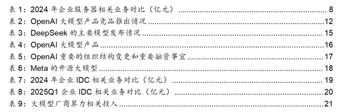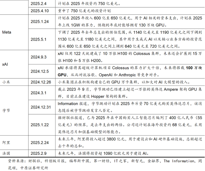 (3)算力:2024年数据中心厂商业绩分化明显,一方面传统IDC竞争加剧,另一方面AIDC快速增长但新进入者众多。Meta计划2025年用于生成式AI以及核心业务方面的投资范围从600亿至650亿美元之间上调到640亿美元至720亿美元之间。腾讯、阿里Q1资本开支分别环比下滑24.9%、22.5%。2024年下半年,我国云计算业务见底回升,2024H2收入241.1亿美元,同比增长17.72%。特朗普在5月在访问期间,与中东达成了大量AI领域的合作,其中沙特计划采购英伟达1.8万块最先进AI芯片,AMD也将为沙特提供价值高达100亿美元的芯片与软件支持;阿联酋与美国在阿布扎比合作建造综合性5GW数据中心,并与多家美国公司合作运营。
