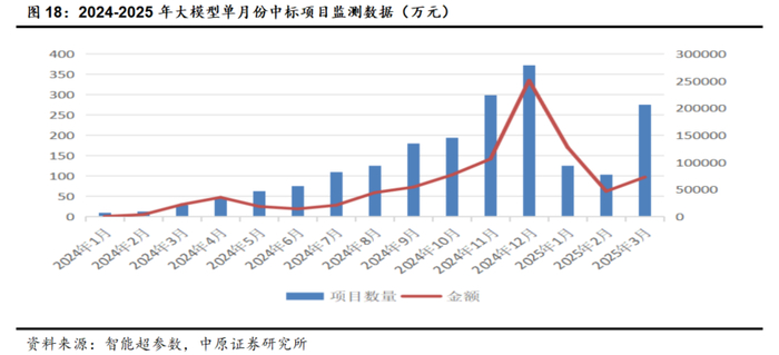 根据智能超参数统计的数据,2025Q1大模型相关中标项目数量为505个,其中121个项目未披露中标金额,其余384个中标项目披露的金额约为24.67亿元,中标项目数量和中标金额同比都有9倍左右的增长。