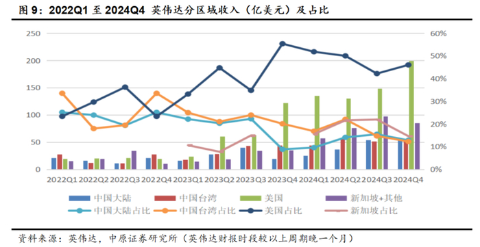 根英伟达最新财报,其来自美国的收入占比较Q3提升了4个百分点至46%,而来自新加坡的收入占比从上个季度的22%降低到15%,来自中国大陆的收入从15%降低到13%。随着Q4美国对华出口管制政策的进一步收紧,我们看到英伟达来自新加坡和中国区域采购金额的占比都出现了下滑。后续在H20禁令的影响下,英伟达对中国大陆出口金额预计将进一步降低。