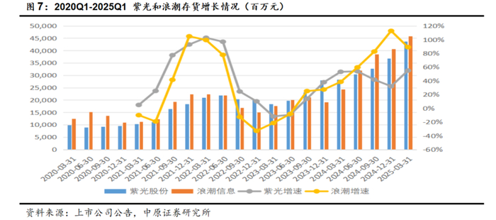 服务器厂商加大芯片备货力度,禁令对短期业务冲击有限,但长期仍需进一步关注。2023Q3开始,浪潮存货增长速度持续加快,从2023Q3的25%增长到2024Q4的113%,2025Q1又继续增长了89%。与此同时,紫光股份存货也保持了较快增长,2024Q3和2024Q4或受到收购新华三股份带来财务压力,增速放缓,但是2025Q1又快速增长了55%。
