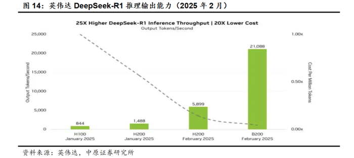 根据此前DeepSeek发布的《DeepSeek-V3 / R1 推理系统概览》的相关数据,其单台服务器8个H800对应的单节点平均输出吞吐量为14.8k Tokens/s,对应单卡1850 Tokens/s,这意味着昇腾单卡已经可以实现超越H800的性能。英伟达在2月25日公布的8张H200和B200 节点的R1推理吞吐(单节点)分别为5899 Tokens/s和21088 Tokens/s,这意味着昇腾也实现了对英伟达官方H200性能的超越,对应B200 约73%的推理吞吐。