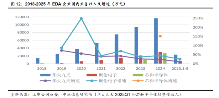 在芯片加快国产化的趋势下,国内EDA企业也受到国产化趋势拉动,维持较高增速。2024年华大九天、概伦电子的国内业务收入分别增长了23.4%和44.27%,芯和半导体也获得了150.38%的收入增长;2025Q1,华大九天收入增长9.77%,概率电子国内业务收入增长24.61%。