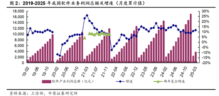 2025年1-3月软件产业增速略有回升。根据工信部数据,2025年1-3月软件业务收入3.15万亿元,同比增长10.6%,较1-2月回升了0.7PCT。软件业务利润总额3726亿元,同比增长11.6 %,较1-2月回升了0.9 PCT,高于收入增速1.0 PCT。