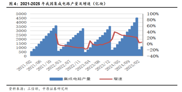 2025年1-3月,我国集成电路在进口依赖度比例和出口在总产量中占比分别为80%(即国产化占比20%)和69%,分别较1-2月回升了6 PCT和7 PCT。考虑到美国出口管制范围的持续扩大及中美关税壁垒等因素的影响,我们认为3月进口芯片突然增多或有较多的厂商提前囤货的因素。