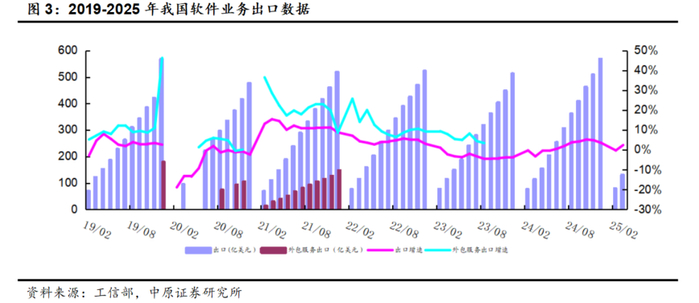 2025年1-3月软件出口增速重回正增长。2025年1-2月软件业务出口金额131亿美元,同比增长2.4%,较2024年回落1.1 PCT,软件行业出口占全行业金额约为3.0%,受到全球贸易政策的直接影响有限。
