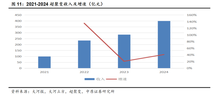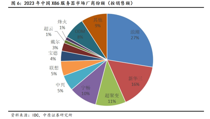 国产服务器龙头超聚变,2024年继续呈现高速增长。2023年超聚变实现总营收283.8亿元,产量30万台,居国内服务器市场份额第二位。对比头部服务器厂商来看,超聚变是行业头部企业中少数实现两位数收入增长的公司。2024年收入超过400亿,同比增速超过40%。同时在海外市场三年复合增速超50%,在互联网和运营商行业三年分别获得10倍和3倍增长。