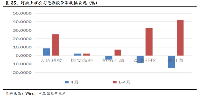 4月,5家河南计算机行业上市公司以调整为主。继续3月上涨了45.05%以后,新开普4月下跌16.66%,在豫股中领跌;众诚科技、恒拓开源分别下跌8.92%和4.69%;捷安高科、天迈科技分别上涨了2.58%和8.59%。