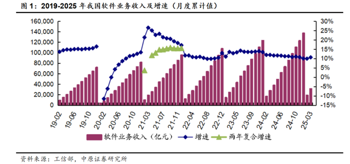 2025年1-3月软件产业增速略有回升。根据工信部数据,2025年1-3月软件业务收入3.15万亿元,同比增长10.6%,较1-2月回升了0.7PCT。