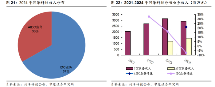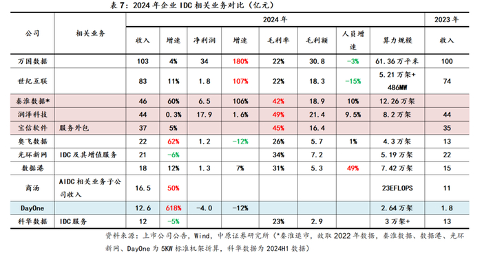 AIDC业务需求快速增长,新进入者众多。根据润泽科技财报,可以看到其AIDC业务上架非常快,2023年上架当年就实现了12亿收入。2024年IDC业务面临了较大的竞争压力,同时公司进行了旧数据中心的改造,导致IDC规模有所下滑,而AICD实现了21%的收入增长。由于公司2024年进行了部分AIDC业务计入方式的调整,从总额法变为净额法,因而实际AIDC业务增长应明显超过21%,同时按照金额法计入收入以后,公司AIDC业务毛利率51.75%,明显高于IDC业务同期47.53%的毛利率水平。商汤科技的AIDC业务在2024年增长了50%达到了16.5亿元,总运营算力达到23EFLOPS,较上年12EFLOPS接近翻倍。