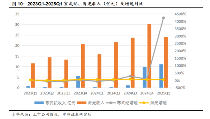 国内数据中心芯片厂商中,寒武纪、海光在经历过2023年增速放缓以后,2024年的收入分别为65.56%和52.40%,都实现了高增长。其中寒武纪2025Q1财报呈现业绩爆发趋势,收入同比增长4230.22%至11.11亿元,环比也实现了12.36%的增长,很好地印证了当前国产芯片和AI算力两大方向的算力需求。