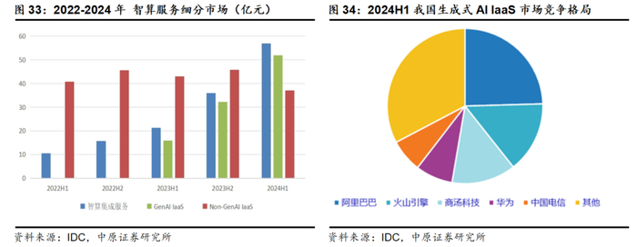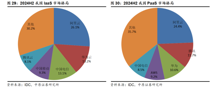 2024年下半年的市场格局来看,IaaS和PaaS前五大厂商的份额分别同比下降了1.0和0.9 PCT,算力资源的广泛建设,带来了市场集中度的持续下降。