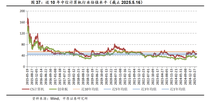 行业的估值位于历史均值之间。根据Wind数据,2025年5月16日中信计算机行业TTM整体法(剔除负值)估值为45.57倍,同期A股估值15.06倍,创业板估值34.55倍。行业近1年、3年、5年、10年的平均估值分别为43.45倍、43.15倍、48.20倍、53.66倍,当前估值仍然位于历史均值水平之间,近3年最高点58.79倍和最低点29.69倍。
