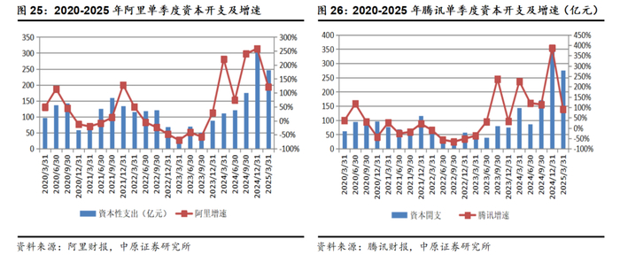 从国内市场来看,阿里腾讯均呈现资本开支环比明显下滑,增加了市场的担忧。腾讯Q1资本开支274.76亿元,同比增长91.4%,环比下滑24.9%,整体位于较高水平。阿里Q1资本开支246.12亿元,同比增长120.7%,环比下滑22.5%。