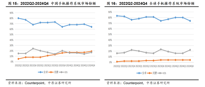 继2024年10月22日纯血鸿蒙HarmonyOS NEXT发布以后,我们看到鸿蒙在2024年Q4的份额也有明显提升趋势。根据Counterpoint的数据,2024Q4鸿蒙以19%的份额继续位居国内手机操作系统第二名,较Q3提升了2 PCT,同时鸿蒙在全球继续占据4%的市场份额。