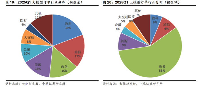 2025Q1大模型在教科、通信、政务、能源领域都有较多的订单,但是相对而言政务行业订单金额却明显领先于其他行业。
