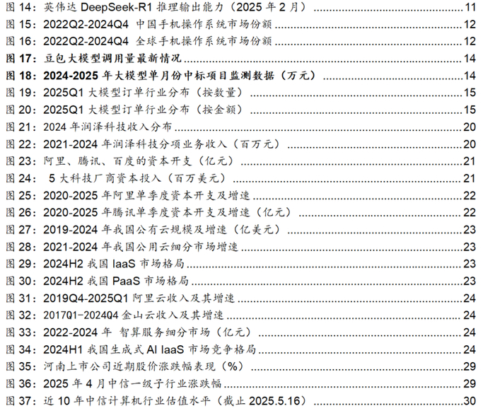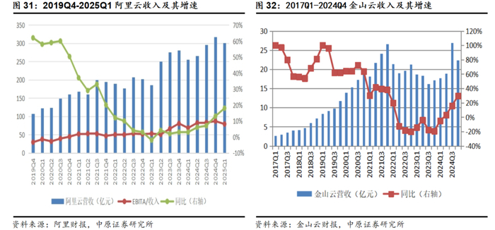 从厂商业绩来看,阿里云和金山云收入增速都从2024Q1开始有了明显的改善趋势。其中2025Q1阿里云收入增速达到了18%,较上个季度提升了5PCT,继续呈现明显加快趋势。