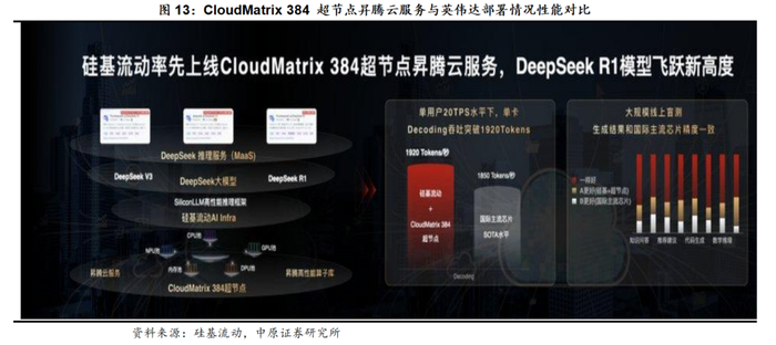 (2)推理方面:4月10日,硅基流动在华为云生态大会上宣布,硅基流动联合华为云基于CloudMatrix 384 超节点昇腾云服务和高性能推理框架SiliconLLM,用大规模专家并行最佳实践正式上线 DeepSeek-R1。该服务在保证单用户 20 TPS 水平前提下,单卡 Decode 吞吐突破 1920 Tokens/s,可比肩 H100 部署性能。同时,经过主流测试集验证及大规模线上盲测,在昇腾算力部署 DeepSeek-R1 的模型精度与 DeepSeek 官方保持一致。