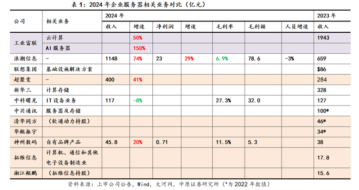 在业绩方面,从2024年服务器行业的行情表现来看,受益于海外科技大厂2024年资本开支增长快于国内,对标海外需求的工业富联增长最为明显。浪潮作为国内互联网厂商服务器的最大供应商,2024年服务器业务增幅明显,但是毛利率显著下滑。国产服务器供应商分化明显,超聚变作为第一大国产服务器供应商,2024年增速明显提升,而神州数码的自有品牌业务下半年销售额不及上半年,增速不及预期。
