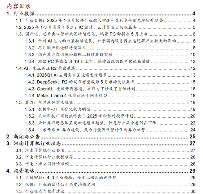 (1)国产化:H20被禁以后,英伟达表示或将针对中国推出新一代特供芯片,但不会再推出Hopper系列芯片。首款鸿蒙电脑搭载鸿蒙5.0操作系统将在5月19日正式发布。美国商务部在废除拜登发布并即将生效的《人工智能扩散规则》,同时将限制的对象转移至华为昇腾(Ascend)芯片、中国人工智能模型。
