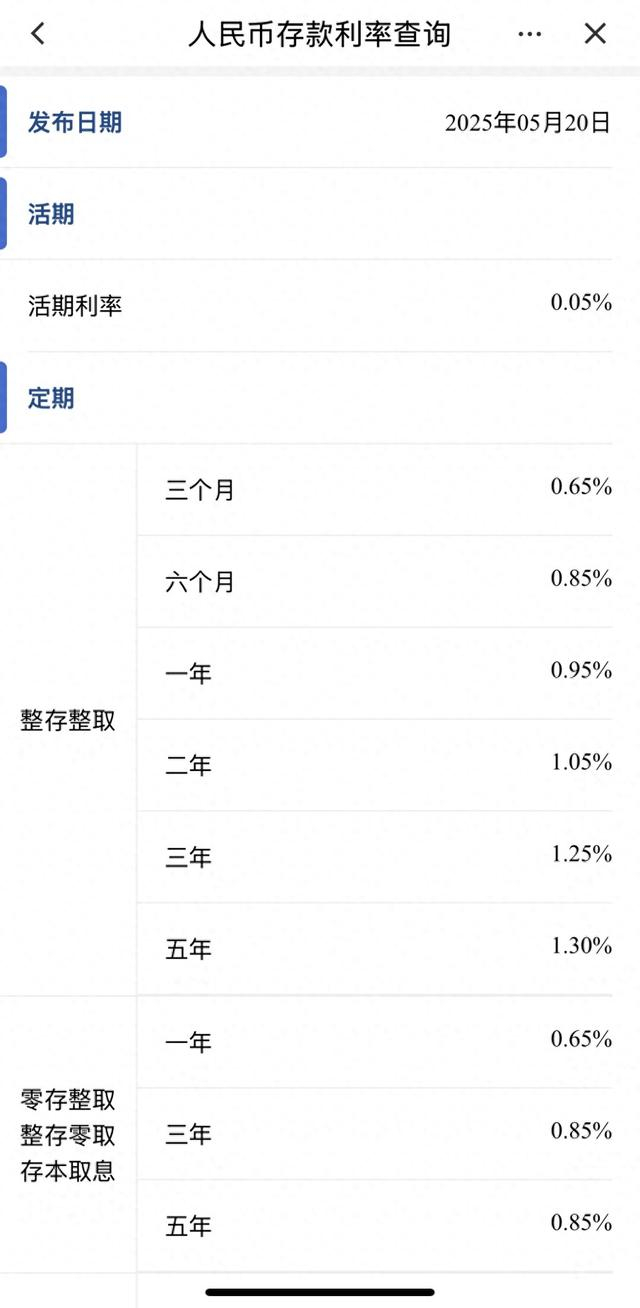 5月20日,建设银行、招商银行在其官方App或网站调整了人民币存款利率表。其中,活期存款下调0.05个百分点至0.05%,各期限定期存款挂牌利率下调0.15-0.25个百分点。具体来说,3个月、6个月、一年期、二年期定期存款挂牌利率均下调15个基点至0.65%、0.85%、0.95%和1.05%,三年期和五年期定期存款挂牌利率均下调25个基点至1.25%和1.30%,调整前上述期限定期存款挂牌利率分别为10.8%、1.00%、1.10%、1.20%、1.50%和1.55%。