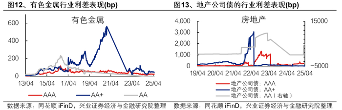 2025年4月,AAA高评级行业利差大多走阔。其中利差收窄幅度较大的行业为房地产、地产中票、地产公司债,利差走阔幅度较大的行业为非银金融、电气设备。