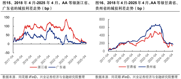 2025年4月各地区低评级城投利差表现分化。样本中,2025年4月广东省低评级城投利差收窄1.58bp,浙江省低评级城投利差收窄2.47bp。其余省份中,贵州省低评级城投利差收窄17.91bp。