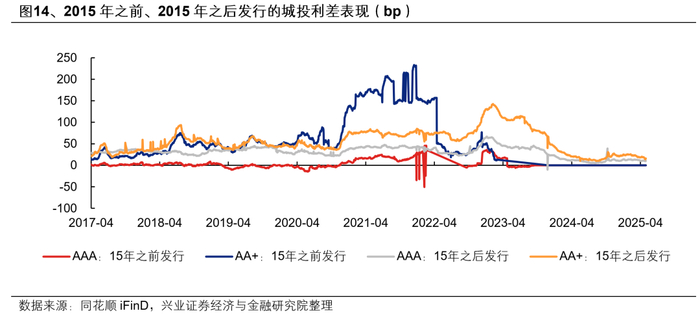 从不同等级的城投利差观察,各等级城投债利差均收窄。2025年4月,在2015年之后发行的AAA等级、AA+等级和AA等级城投利差分别收窄0.43bp、2.55bp和5.73bp。