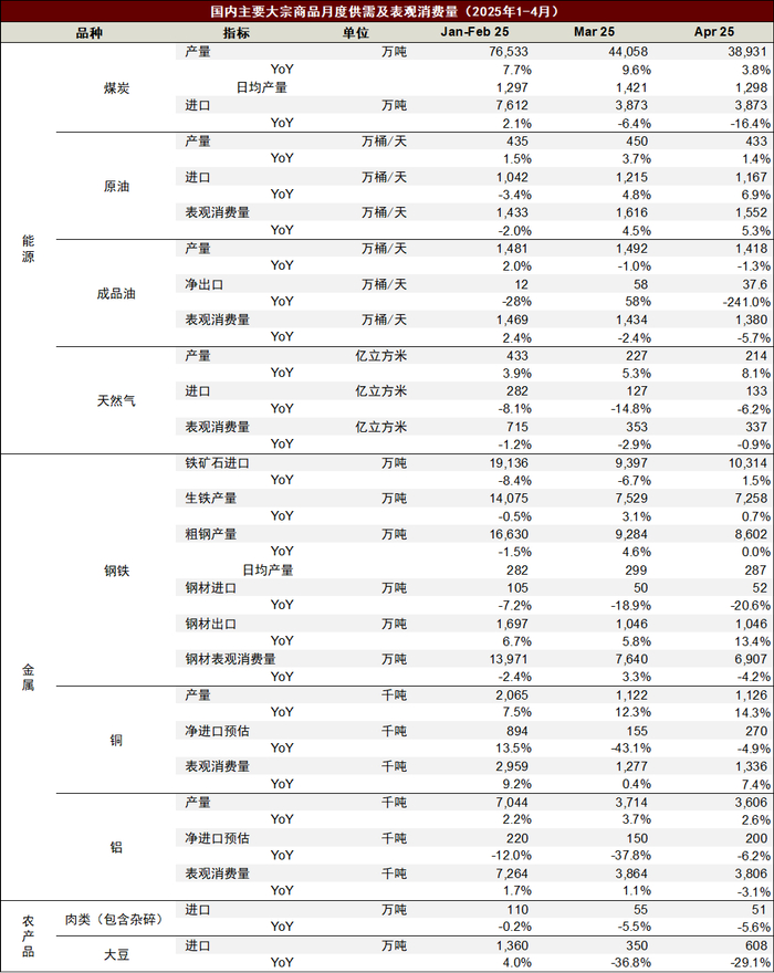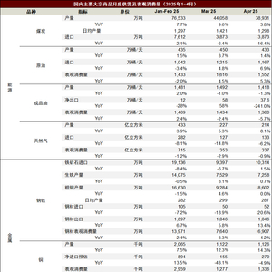 上周中美贸易谈判出现积极进展以来,大宗商品市场整体风险偏好得到明显提振,工业金属和能源商品价格反弹,贵金属价格回落。短期看,关税政策不确定性下降后,商品实物基本面情况对于市场预期的影响或有所恢复。我们在本篇报告中对4月国内主要商品供需情况和后市展望进行更新。