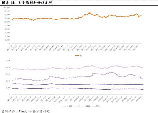 本周钢铁、铜、铝、橡胶价格均有下降。本周(5 月 12日- 5月16 日),我们重点跟踪的钢铁、铜、铝、橡胶、塑料均价分别为 0.37/7.87/2.02/1.20/0.72 万元/吨,本周周度环比分别为 +2.4%/+0.3%/+2.6%/+4.5%/+0.4%。5月 1 日- 5月16日价的月度环比分别为-7.0%/+3.0%/-0.1%/-6.4%/-0.8%。