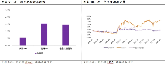 本周北证50涨3.1%,华鑫北证指数涨3.0%。近一年以来(截至2025年5月16日),北证50、华鑫北证指数涨跌幅分别为79.8%、1.5%,相对沪深300的收益率分别为+72.5pct、-5.8pct。