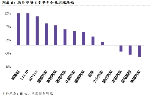 本周我们跟踪的14家海外整车厂涨跌幅均值为4.9%,中位数为5.2%。特斯拉(17.3%)、LUCID(13.1%)、RIVIAN(10.9%)等表现居前,本田汽车(-4.2%)、宝马集团(-3.5%)、丰田汽车(-2.3%)等表现靠后。