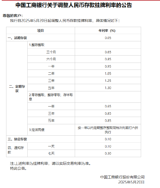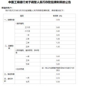5月20日金融一线消息,中国工商银行下调人民币存款利率,其中活期利率下调5个基点至0.05%;定期整存整取三个月期、半年期、一年期、二年期均下调15个基点,分别为0.65%、0.85%、0.95%、1.05%;三年期和五年期均下调25个基点,分别至1.25%和1.3%。定期零存整取、整存零取、存本取息三种期限均下跌15个基点。7天期通知存款利率下调15个基点至0.3%。