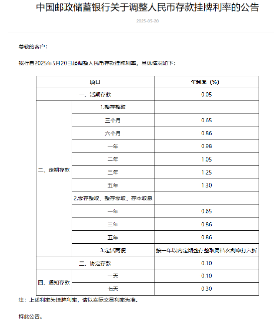 5月20日金融一线消息,邮储银行对多个期限的人民币存款利率进行了下调,其中活期存款利率下调至0.05%;定期三个月期、半年期、一年期、三年期和五年期均有下调,分别为0.65%、0.86%、0.98%、1.25%和1.30%。
