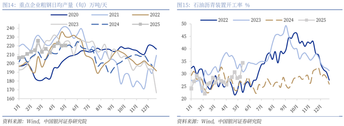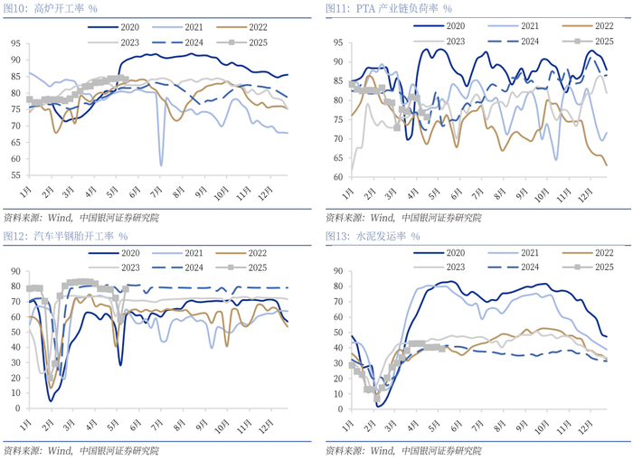 生产表现分化,多数指标小幅下跌0.5-1个百分点。生产相关数据方面,本周表现环比分化,其中PTA负荷率(数据滞后四周)、高炉开工率环比回落1.13个百分点、0.51个百分点至75.64%、84.13%,而汽车半钢胎开工率恢复至节前水平,环比回升19.98个百分点至78.33%。